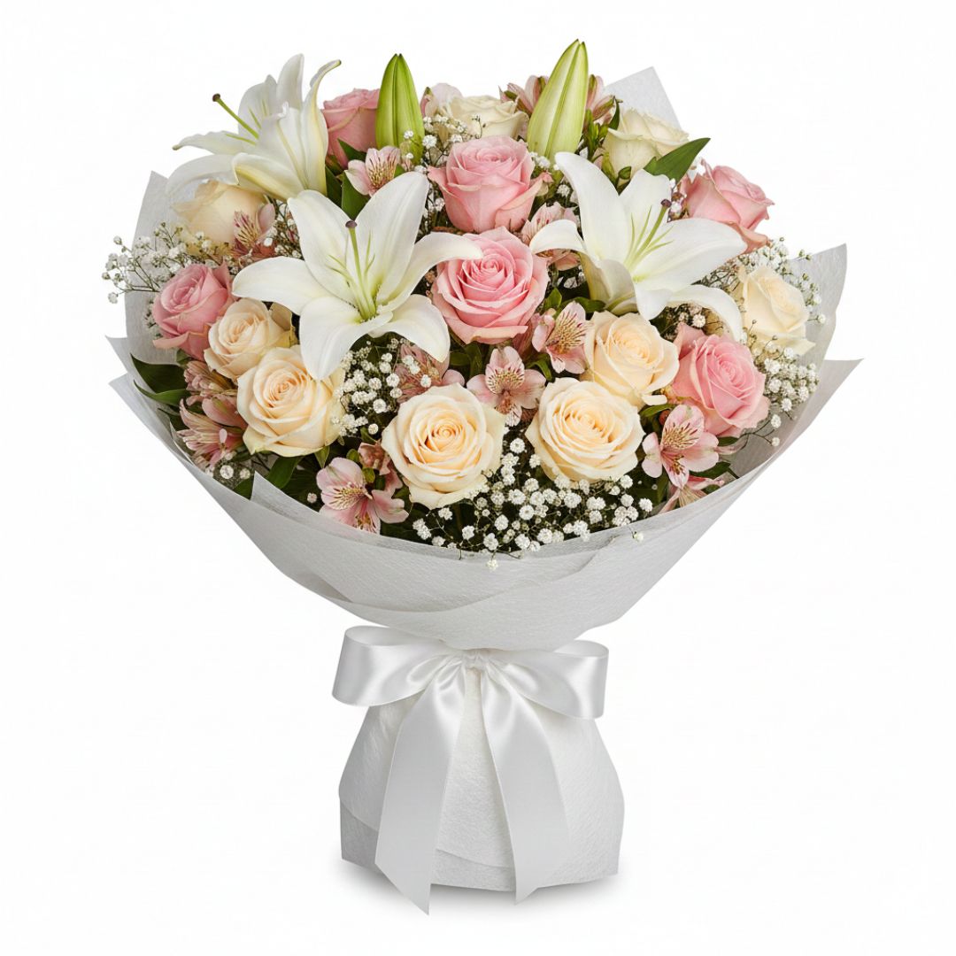 Celebrate their birthday with this stunning mixed birthday bouquet, combining elegance, sweetness, and vibrant charm. White lilies symbolize purity and celebration, pink roses express admiration and joy, and peach roses convey gratitude and warmth. Accented with delicate alstroemeria and gypsophila, and wrapped in white paper with a ribbon, this birthday bouquet is perfect for birthday surprises, heartfelt messages, or gifting someone special—a thoughtful way to make their day memorable.