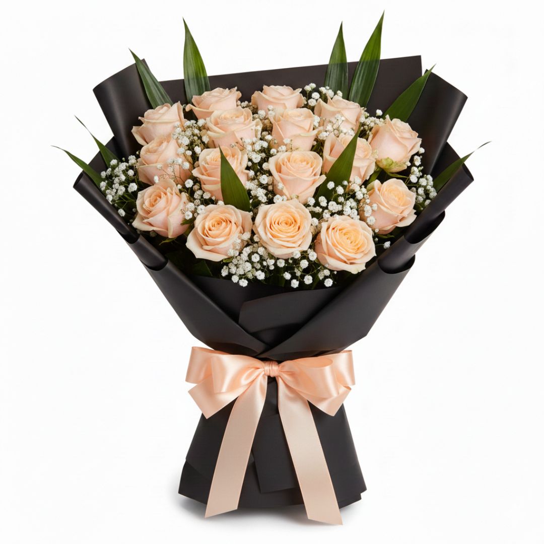 Blush Allure is a soft and luxurious Valentine’s bouquet featuring 15 delicate peach Jumelia flowers, accented with gypsophila and dracaena for texture and elegance. Wrapped in black paper with a peach ribbon, it exudes warmth, sophistication, and romantic charm, making it perfect for expressing gentle love and affection.