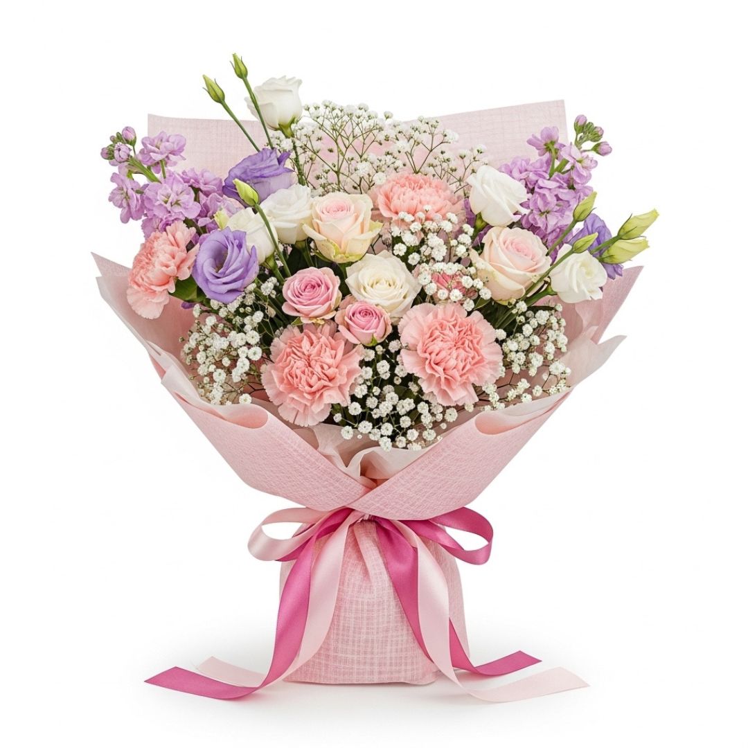 A lovely arrangement of 10 pink & white roses, 4 pink carnations, 4 purple eustoma, and 2 pink matthiola, wrapped in pink paper and tied with a matching pink ribbon. With its romantic shades and soft textures, this bouquet is designed to express appreciation, love, and heartfelt gratitude for Mom.