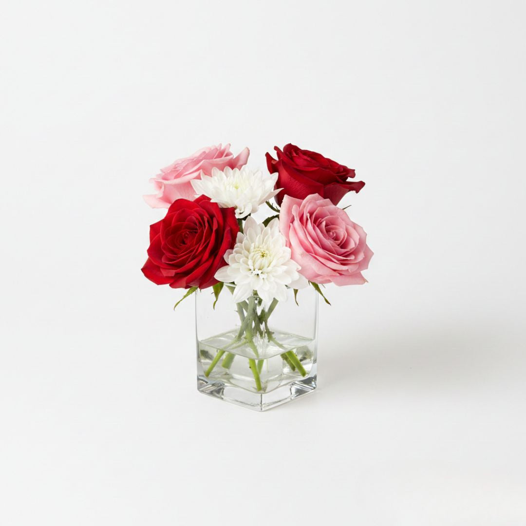 The Blushing Hearts vase is a delicate and charming Valentine’s gift. With a mix of red and pink roses and pure white chrysanthemums, it beautifully symbolizes love, affection, and purity. Its compact square design makes it perfect for a desk, bedside, or cozy romantic corner.