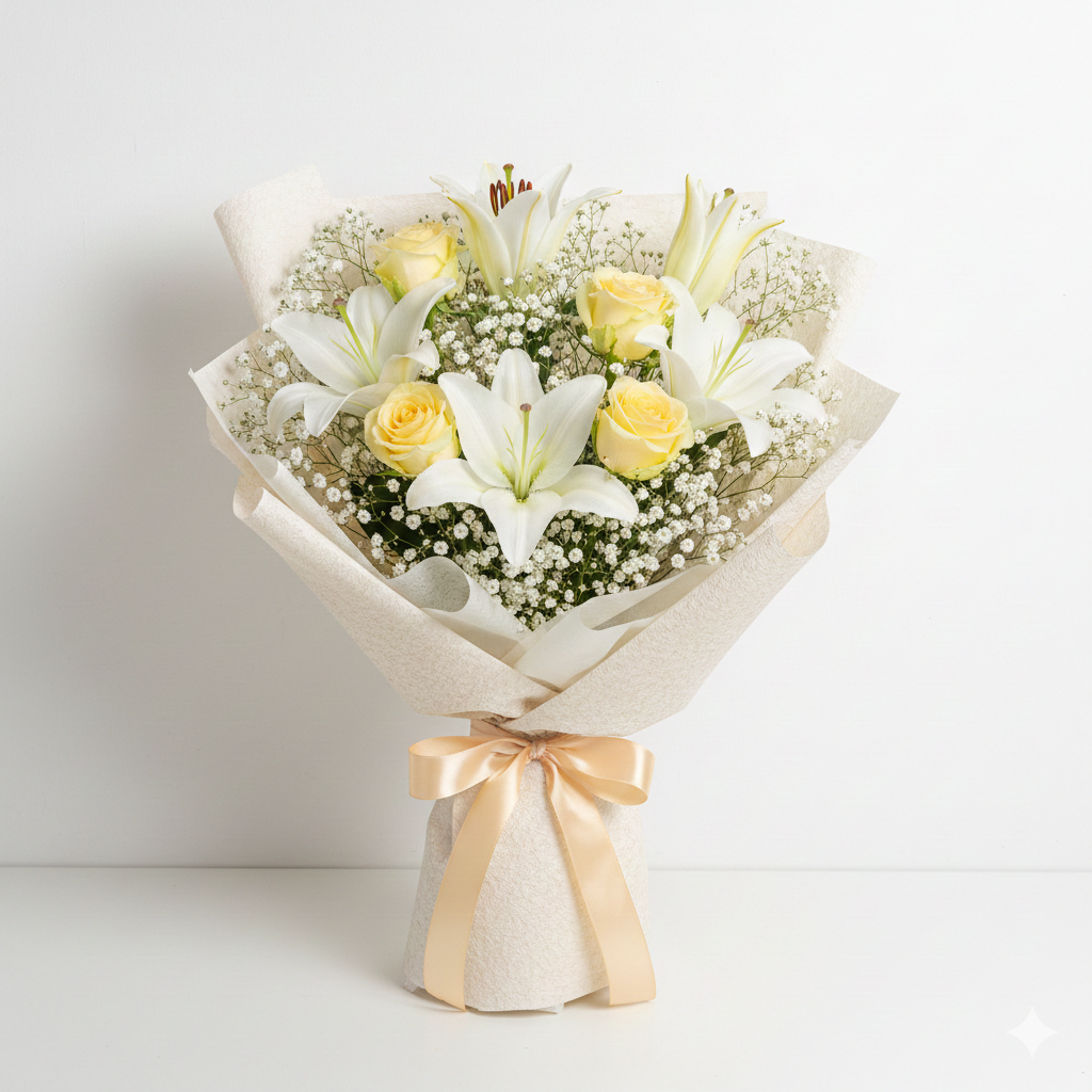 Celebrate their birthday with this cheerful and elegant bouquet of white lilies and light yellow roses. White lilies symbolize purity and elegance, while light yellow roses convey happiness, friendship, and joy. Accented with delicate gypsophila and wrapped in off-white paper with a light golden ribbon, this birthday bouquet is perfect for birthday surprises, thoughtful gifts, or heartfelt celebrations. Bright, fresh, and elegant, it’s a wonderful way to make their special day unforgettable.