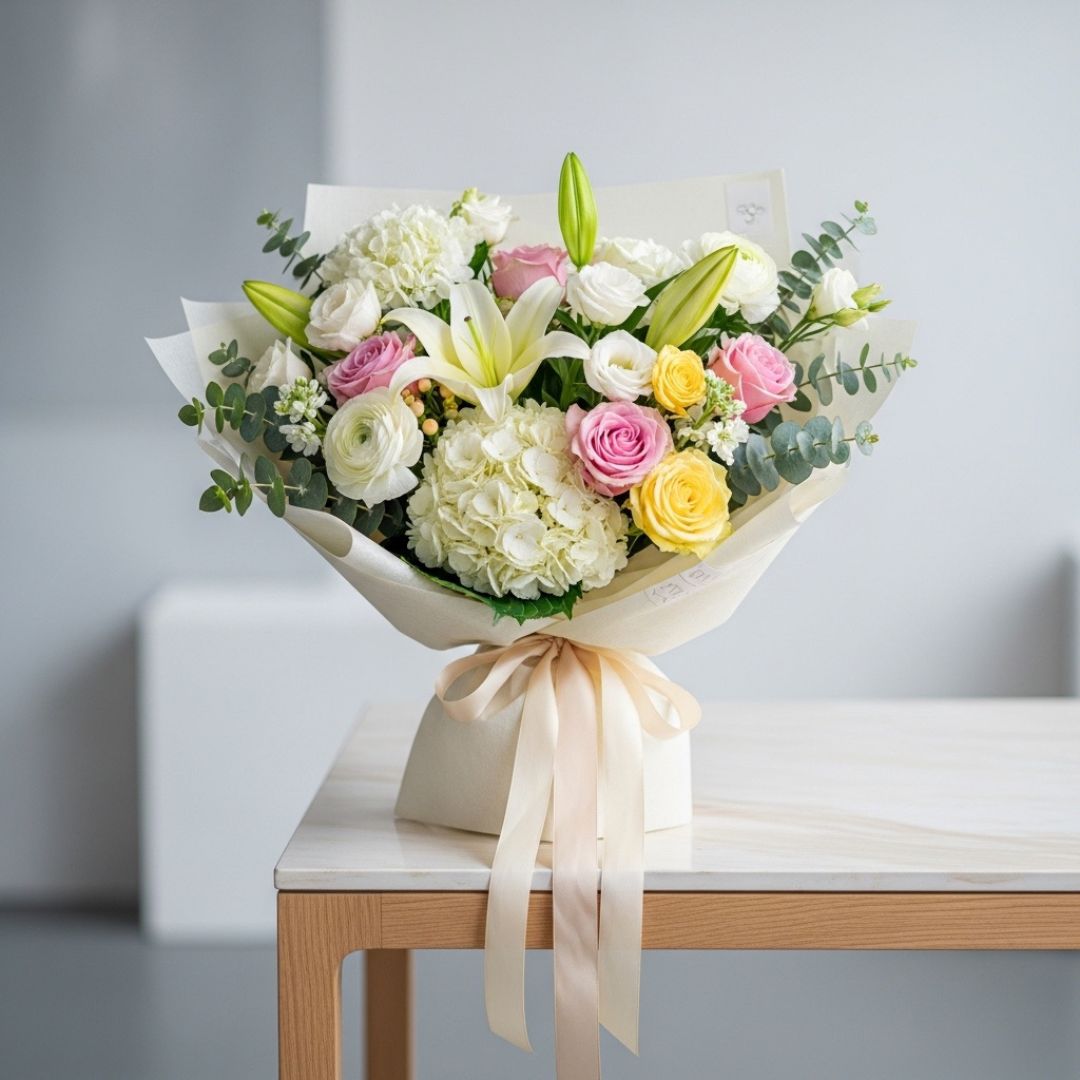 Radiant Sun & Rose is a cheerful and elegant bouquet that blends love, warmth, and sophistication. Red roses symbolize passion, lilies bring purity, and sunflowers add sunshine and happiness. Perfectly arranged for visual impact and texture, this bouquet is a premium floral statement ideal for gifting, celebrations, or brightening any special occasion.