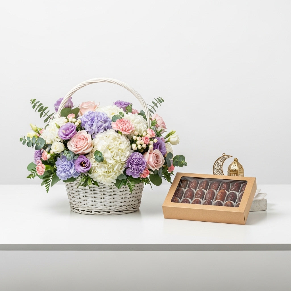 Celebrate the spirit of the holy month with this charming Ramadan gift set featuring 5 fresh pink roses and purple eustoma, beautifully arranged with delicate fillers and lush greenery in a classic woven basket. Paired with a luxury box of 20 premium dates, this set perfectly combines elegance and tradition.