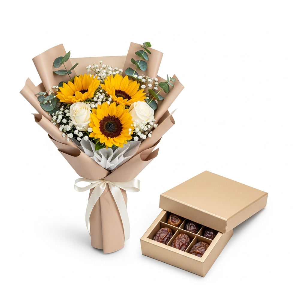 A warm and cheerful Ramadan gift set featuring 3 bright sunflowers and 2 elegant white roses, beautifully arranged with delicate gypsophila and fresh eucalyptus, wrapped in premium neutral-toned paper. Paired with a luxury box of 6 premium dates, this set is a perfect balance of beauty and tradition.