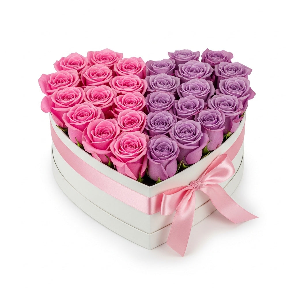 A stunning combination of elegance and charm, this beautiful heart-shaped arrangement features 15 fresh pink roses and 15 luxurious purple roses, perfectly arranged to create a striking two-tone design. The blend of soft pink and rich purple symbolizes admiration, grace, and deep appreciation.