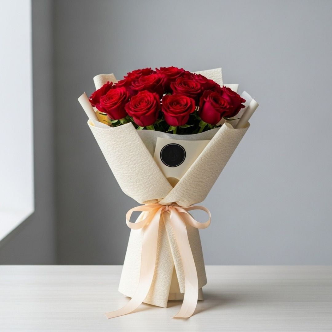 A hand-tied bouquet featuring 14 red roses, elegantly wrapped in off-white premium paper and finished with a matching ribbon for a refined and luxurious presentation.