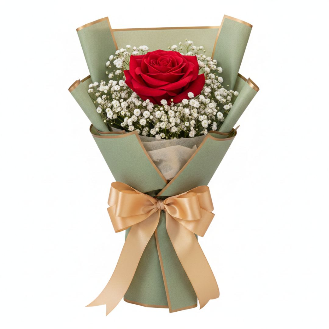 Celebrate love with simplicity and elegance with our Valentine’s Special Single Lovet Bouquet. Featuring 1 stunning red rose, delicately filled with gypsophila, wrapped in luxurious nude light green paper with a golden border, and finished with a light golden ribbon. Perfect for Valentine’s Day flowers, romantic gifting, luxury single rose bouquets, and expressing heartfelt love in the most charming way.