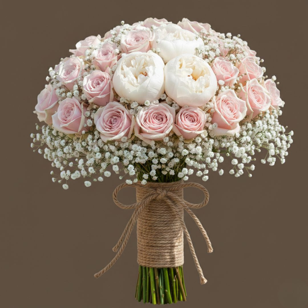 Celebrate your wedding day with this romantic bridal bouquet of pink roses with white punies, symbolizing love, admiration, and tenderness. The gypsophila filler adds a soft, dreamy touch, making it perfect for weddings, bridal photoshoots, or engagements.
